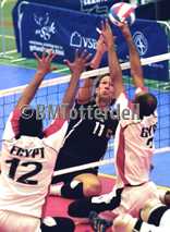Used to block the attack. A good blocking team makes this skill look easy, it is not and has as much to do with timing as jumping ability. One, two and three man blocks are all used.